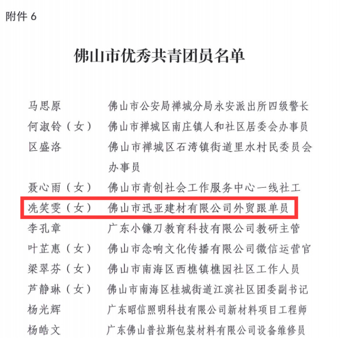 2021年5月8日,共青團(tuán)佛山市委員會公布《關(guān)于表彰2020-2021年度佛山市五四紅旗團(tuán)委(標(biāo)兵)、五四紅旗團(tuán)支部(標(biāo)兵)、優(yōu)秀共青團(tuán)干部、優(yōu)秀共青團(tuán)員的決定》,佛山市迅亞建材有限公司團(tuán)支部團(tuán)員冼笑雯榮獲市“優(yōu)秀共青團(tuán)員”榮譽稱號。